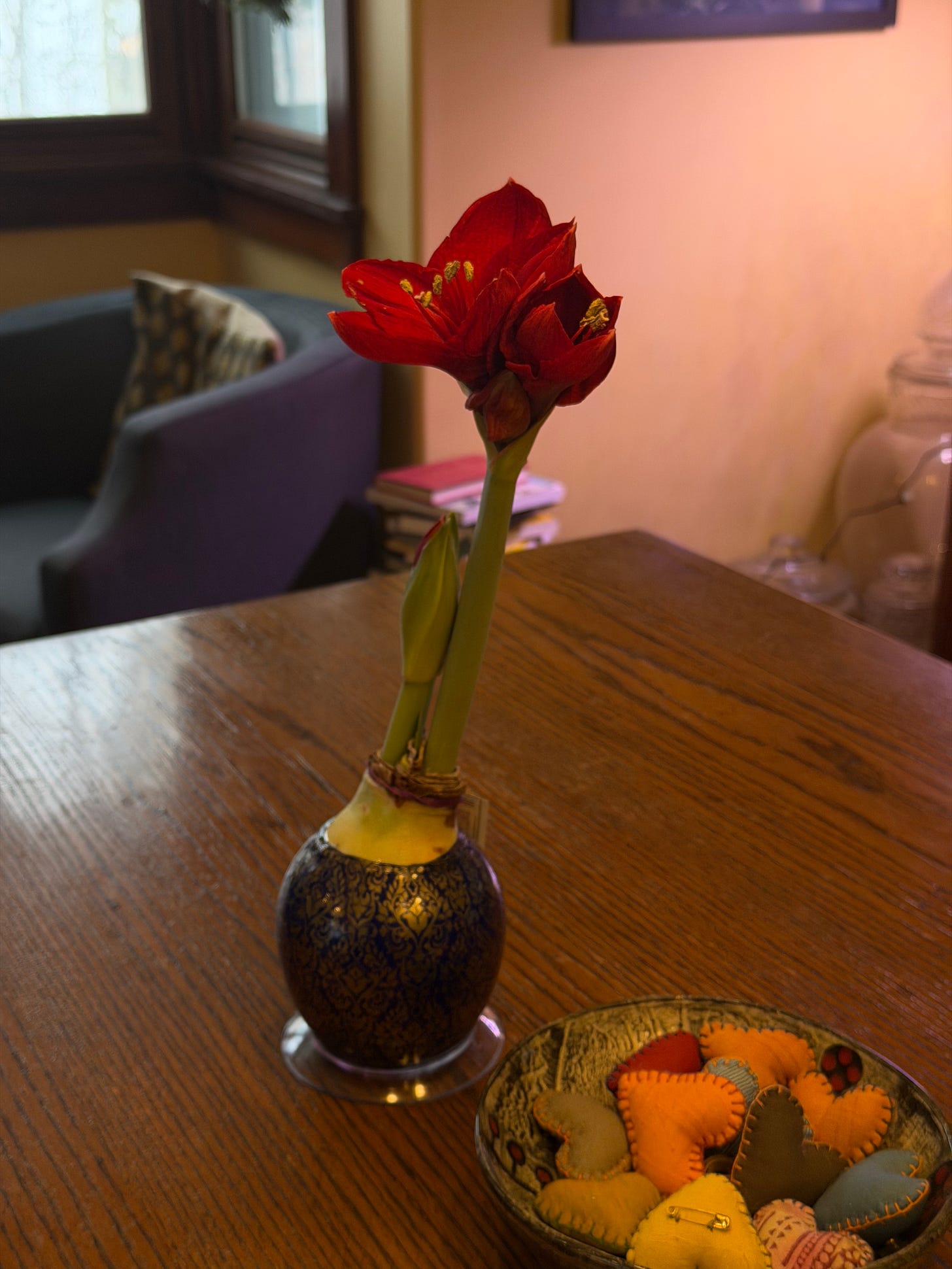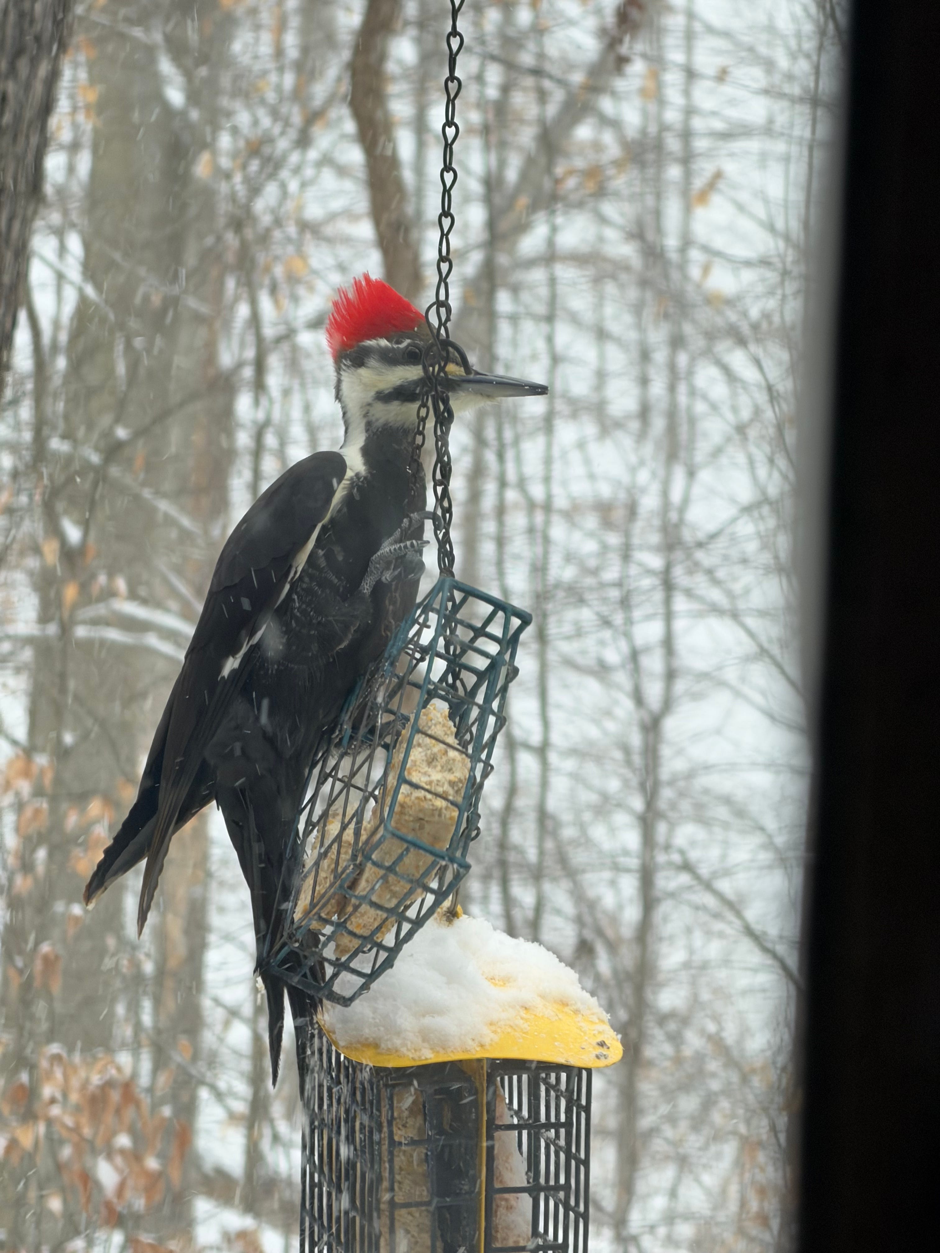 not so much one inch today…but during the snowstorm a flower my friend gave me for the holidays bloomed! Also some views of our little valley in the snow and a woodpecker on my feeder…knowing she’s gorgeous!